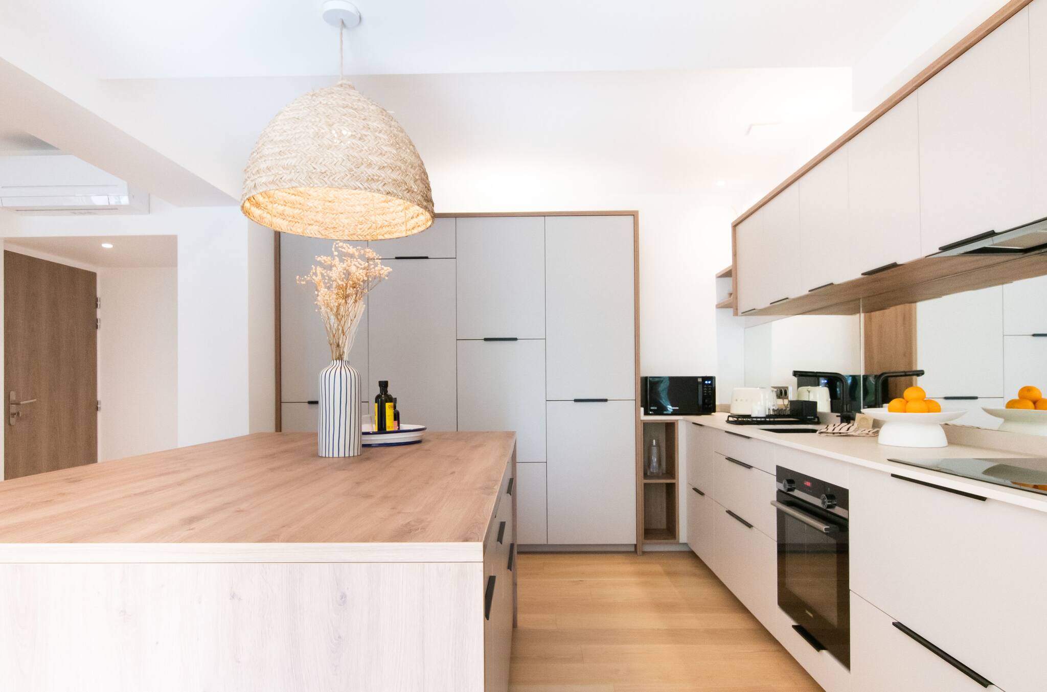 La cocina americana totalmente equipada será un verdadero placer para los amantes de la cocina. Incluye todos los equipos necesarios: refrigerador, congelador, lavavajillas, horno, microondas, cafetera, hervidor, y una colección completa de vajilla y utensilios de cocina.