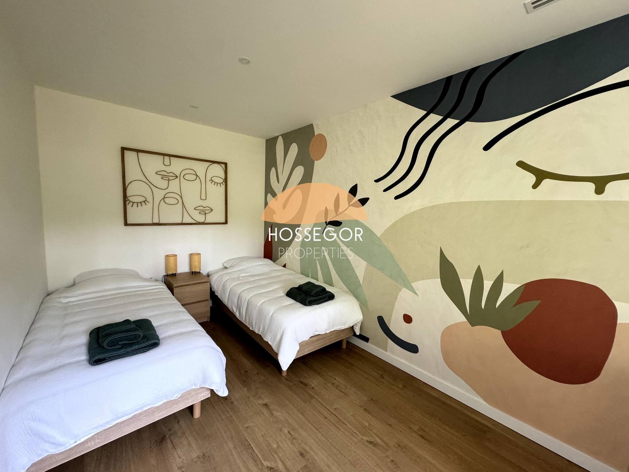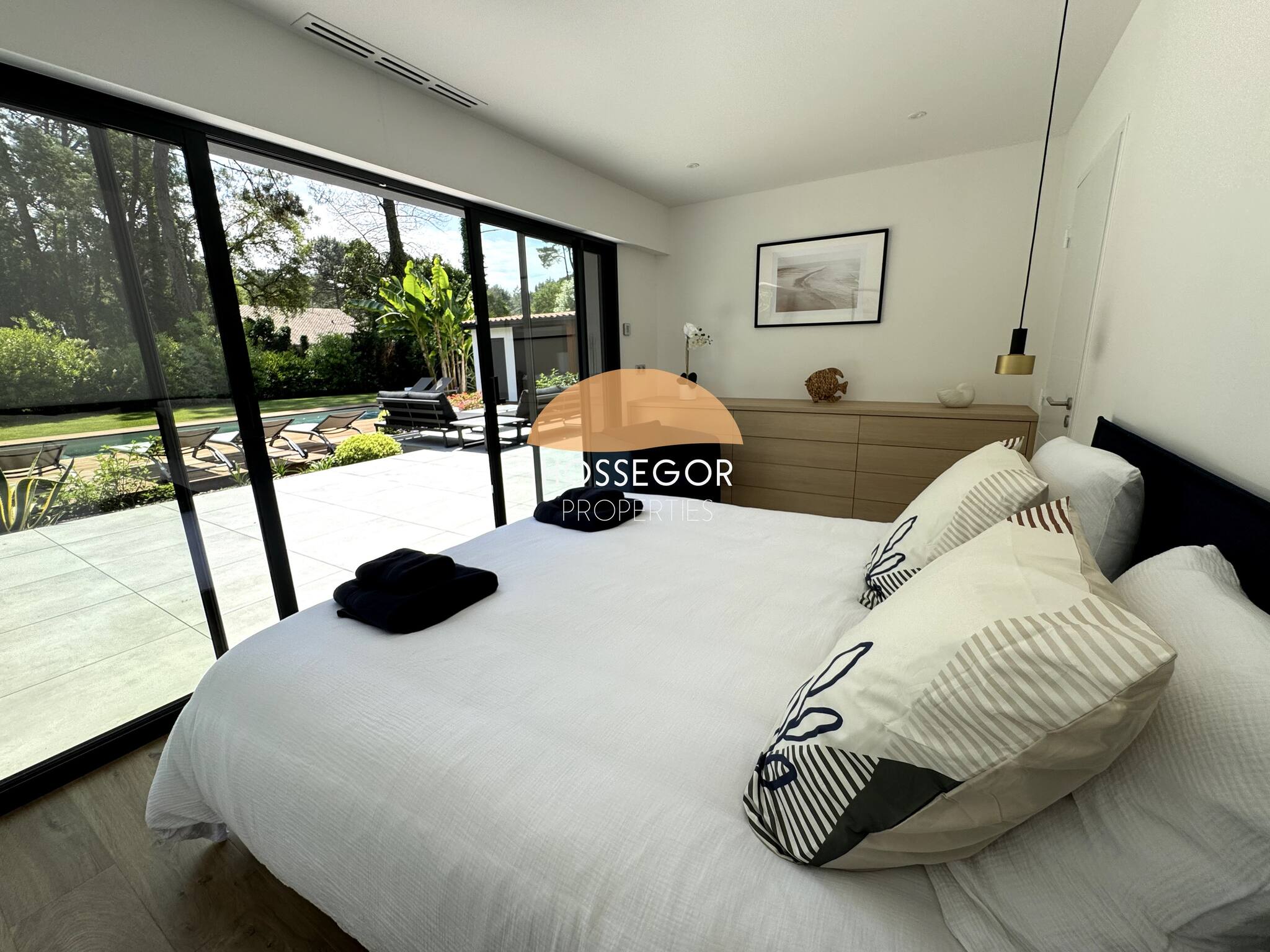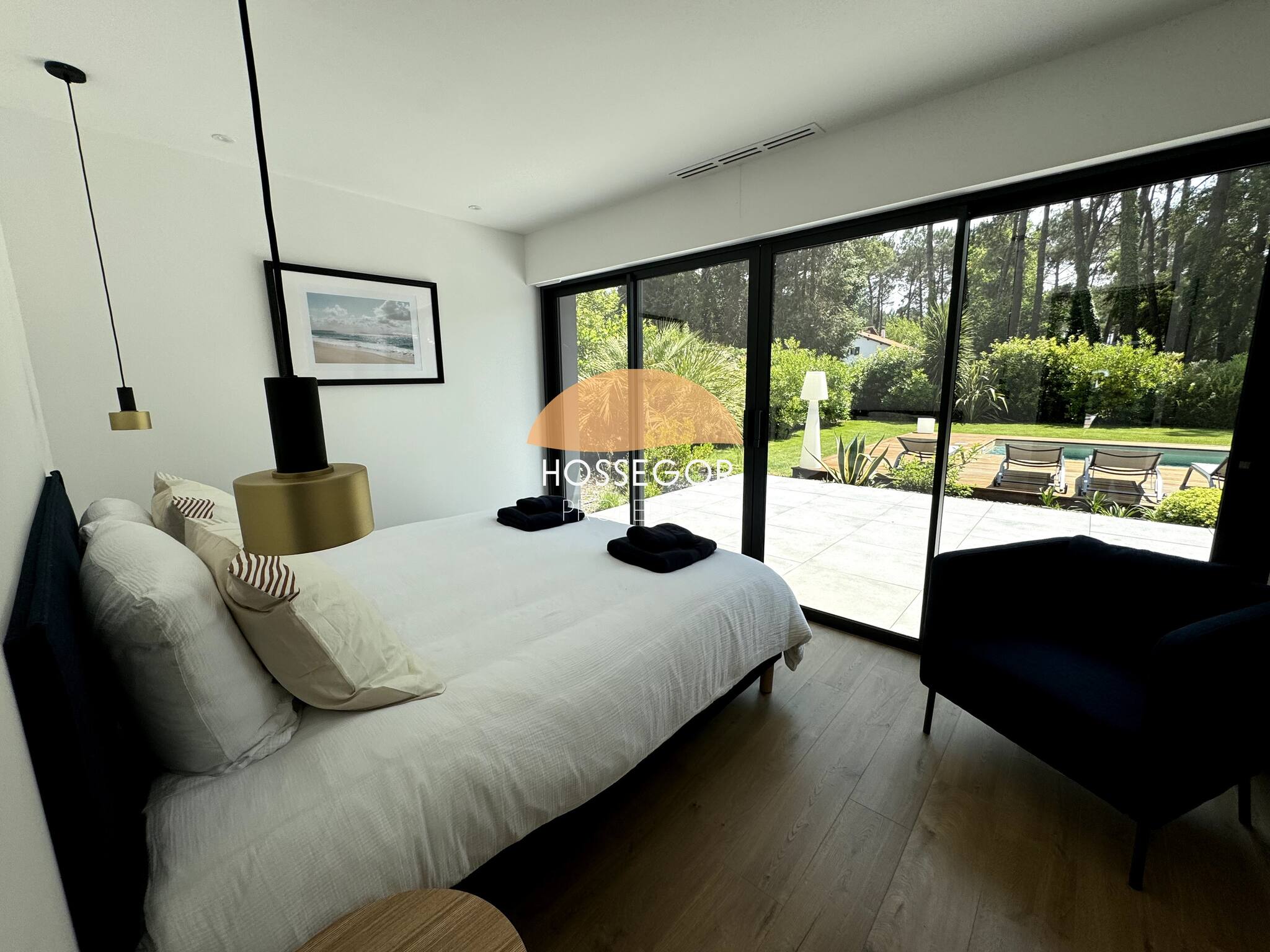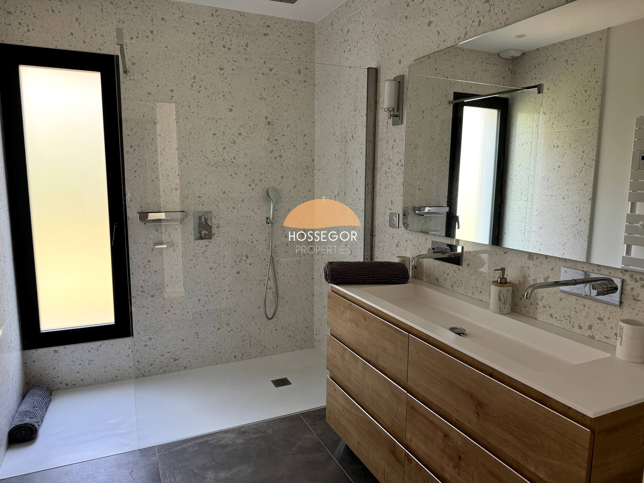Encontrará 2 suites parentales que le ofrecen intimidad y confort óptimo. En la planta baja se encuentra 1 habitación para adulto o niño, con 2 camas individuales que pueden convertirse en cama doble (160x200), 1 habitación dormitorio y un cuarto de ducha con un mueble de doble lavabo, en un estilo bruto-chic que resume la atmósfera de la villa.