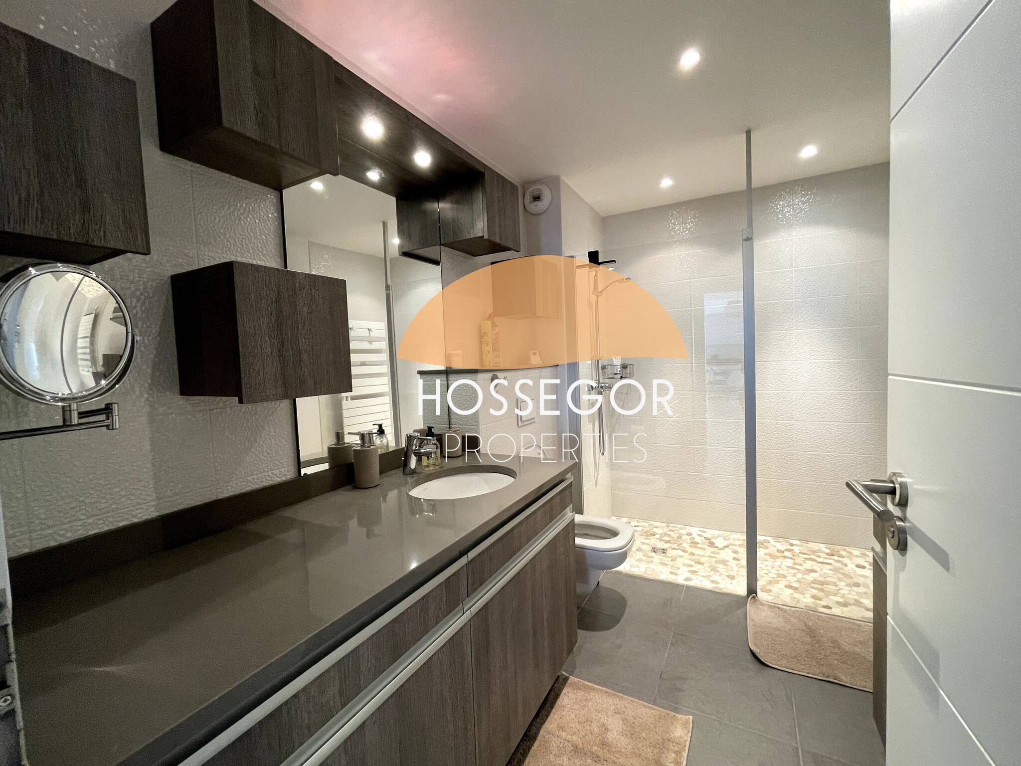 - Une salle d'eau avec grande douche à l'italienne sans marche, un WC, et un meuble de salle de bain simple vasque.