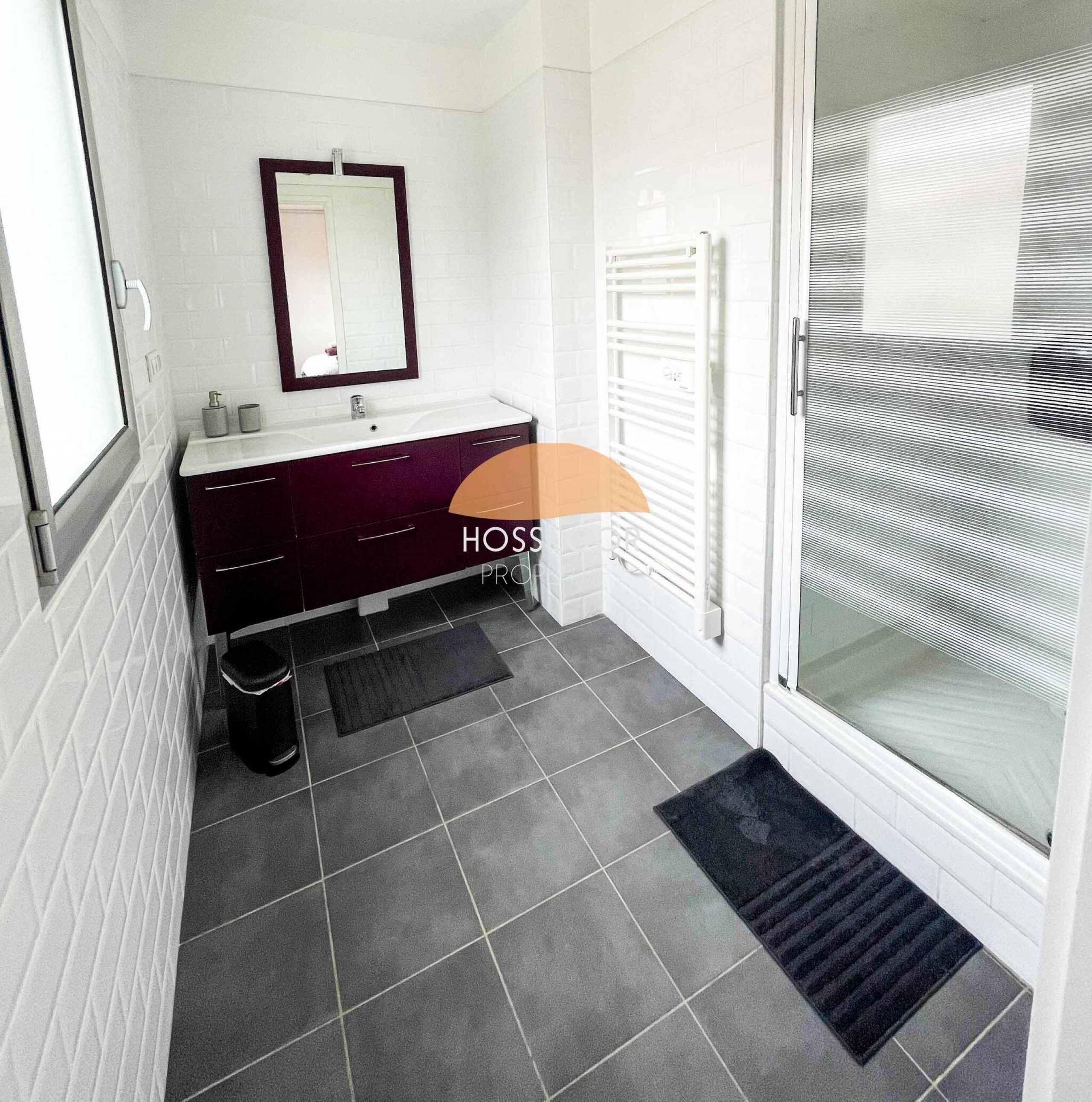 - Une salle d'eau avec grande douche à l'italienne sans marche, un WC, et un meuble de salle de bain simple vasque.