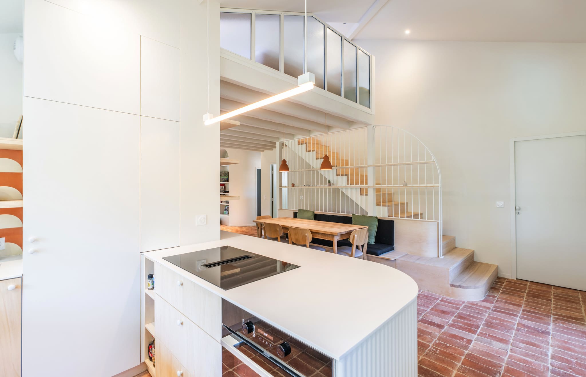 La pièce à vivre se compose d'un salon, d'une salle à manger avec banquette pour plus de convivialité et d'une cuisine au couleurs douces et clairs. Vous accéderez depuis ce niveau à une terrasse nichée dans les arbres afin de vous réunir autour d'un verre pendant les longues soirées d’été. Une seconde terrasse plus intimiste avec un coin repas disposant d'une plancha et au bord de la piscine vous permettra de partager de beaux moments de convivialité.