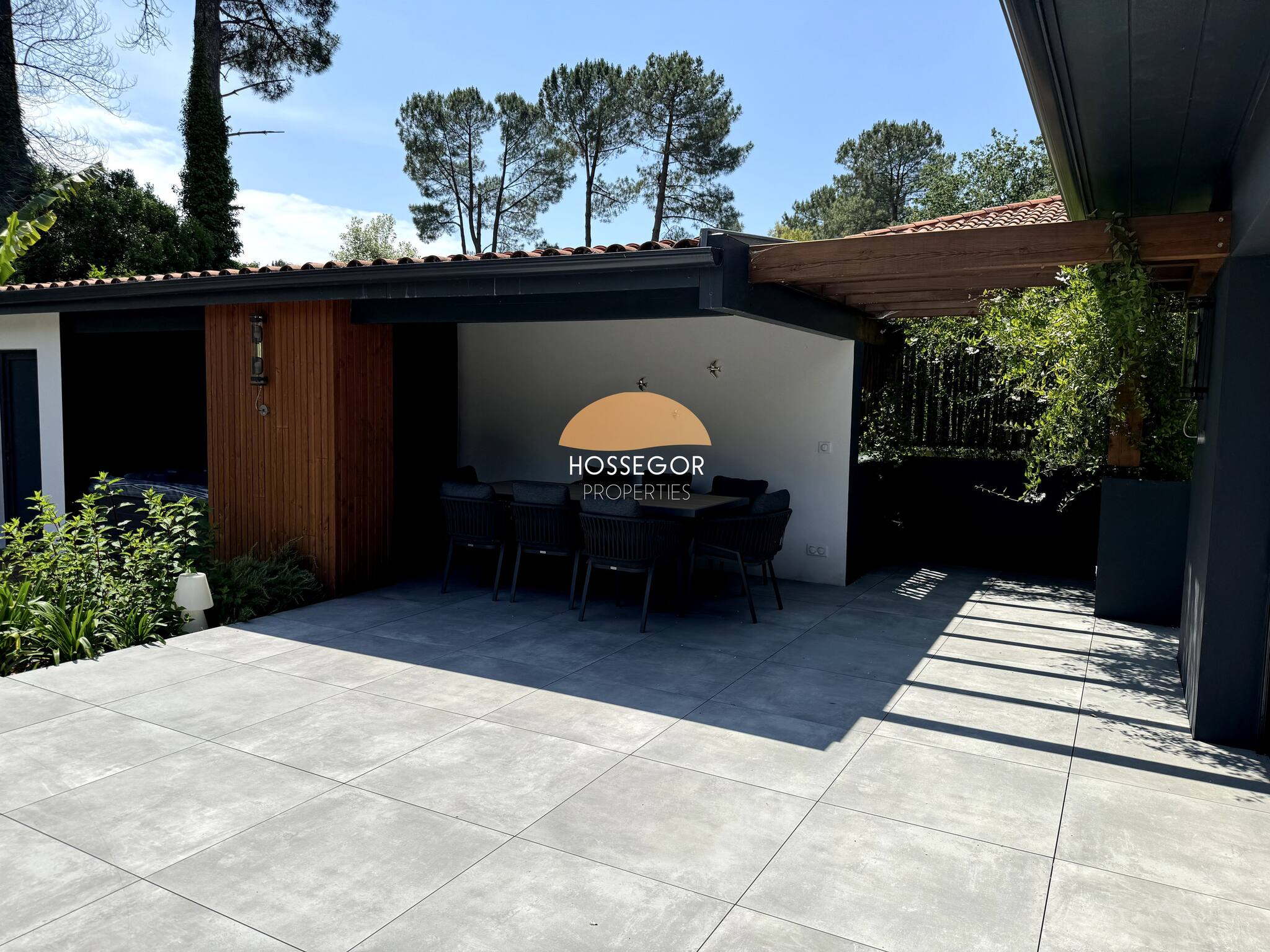 Entre Seignosse Bourg et la Zone Pedebert de Hossegor, c'est à l'arrière de la gendarmerie de Seignosse que vous trouverez cette villa contemporaine, pleine de charme. Au calme, le quartier est retiré de l'effervescence globale.