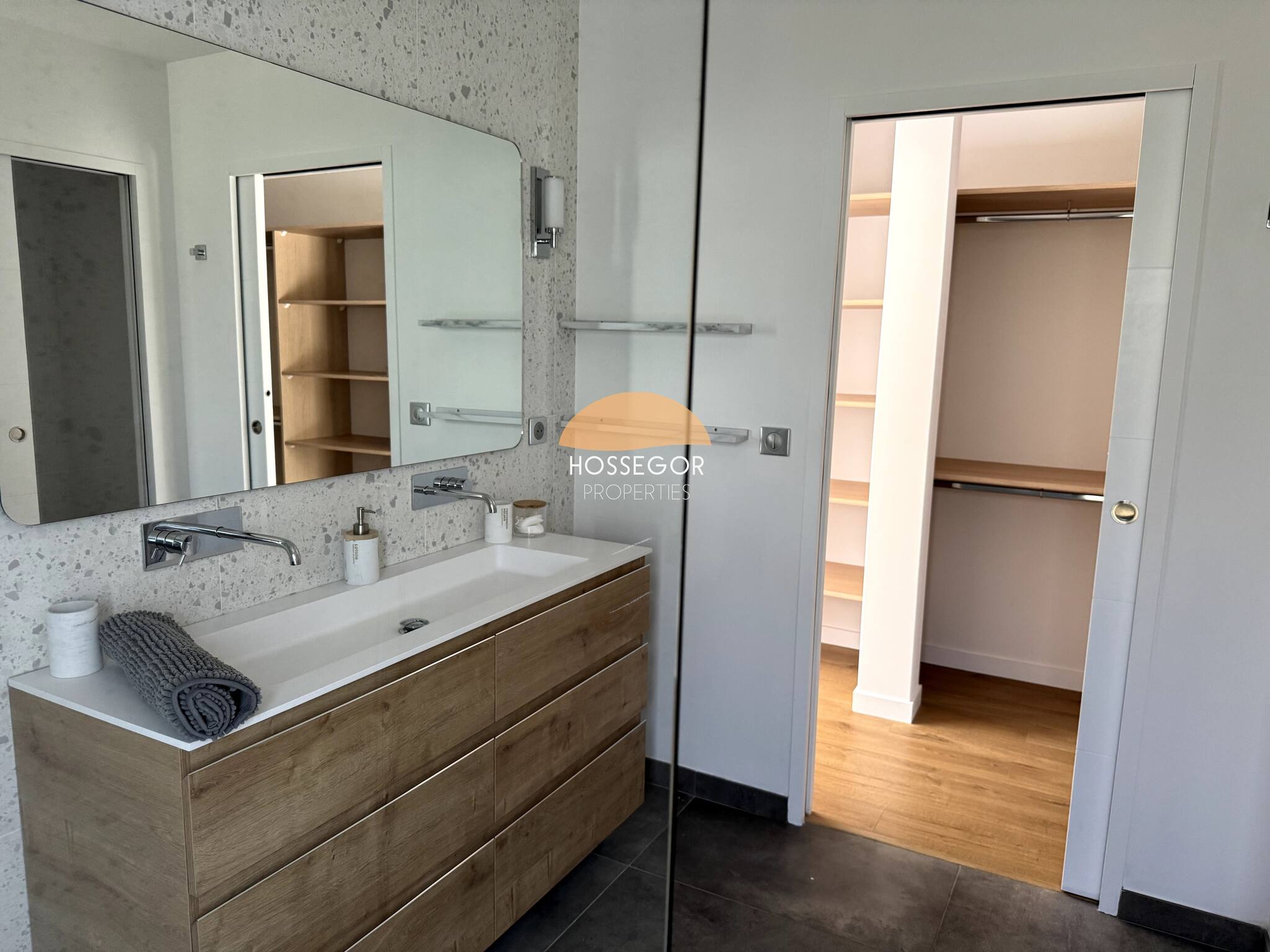 - Une salle d'eau avec double vasques et douche,