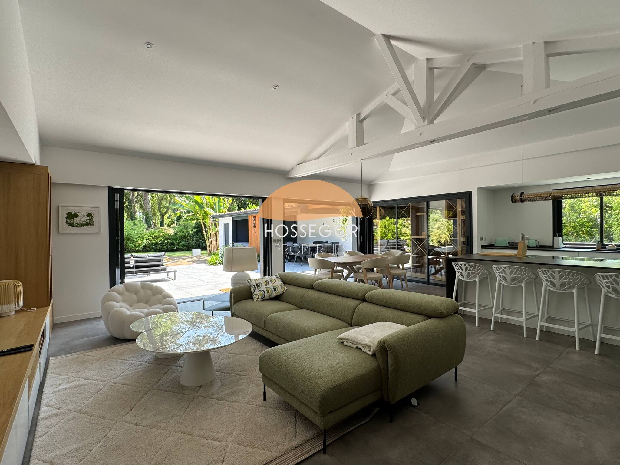 La pièce à vivre se compose d'un salon, d'une salle à manger avec banquette pour plus de convivialité et d'une cuisine au couleurs douces et clairs. Vous accéderez depuis ce niveau à une terrasse nichée dans les arbres afin de vous réunir autour d'un verre pendant les longues soirées d’été. Une seconde terrasse plus intimiste avec un coin repas disposant d'une plancha et au bord de la piscine vous permettra de partager de beaux moments de convivialité.