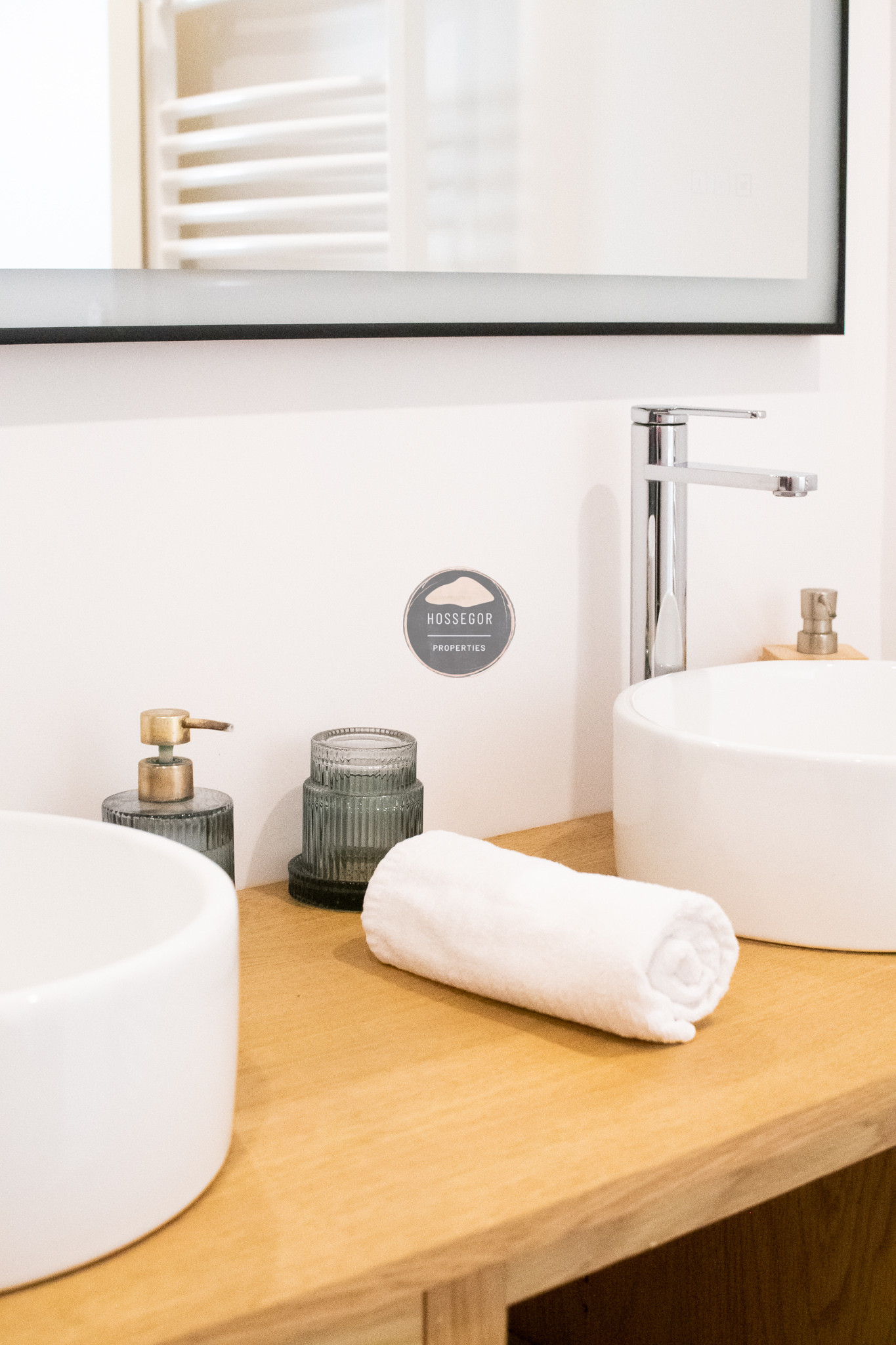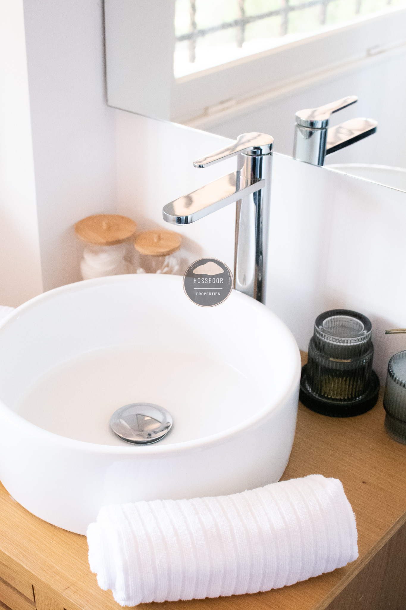 Vous trouverez 2 suite parentales vous offrant une intimité et un confort optimal. Au rez de chaussée se trouve 1 chambre pour adulte ou enfant, avec 2 lits simples pouvant être mis en lit double (160x200) , 1 chambre dortoir et une salle de douche avec un meuble double vasque, dans un esprit brut-chic qui résume l’atmosphère de la villa.