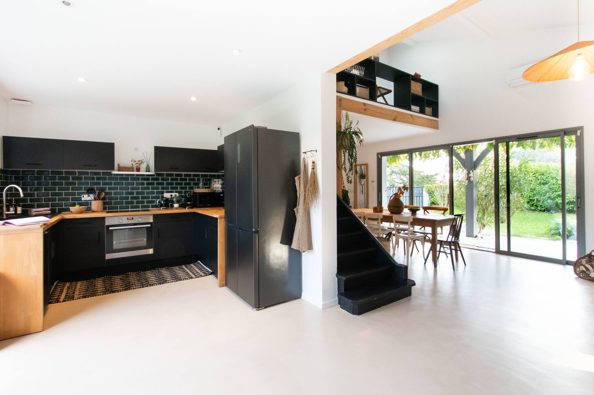 La cuisine, moderne et fonctionnelle, s’ouvre sur un vaste séjour baigné de lumière naturelle grâce à de larges baies vitrées donnant sur la terrasse et le jardin paysager.
