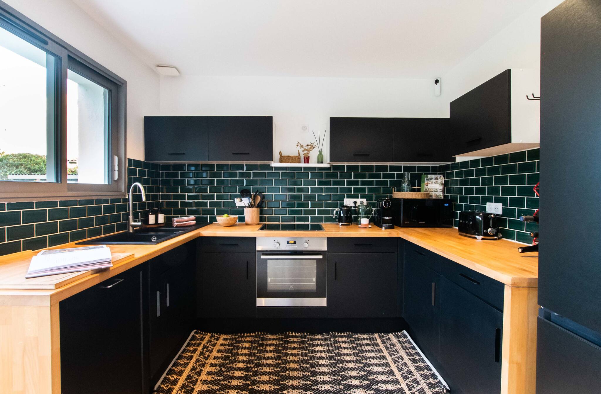 - Une cuisine équipée ouverte comprenant four, four à micro onde, plaques, hottes, lave vaisselle, cafetière, bouilloire électrique, grille pain, réfrigérateur, et congélateur. A l'arrière cuisine, un lave linge et un sèche linge sont à votre disposition.